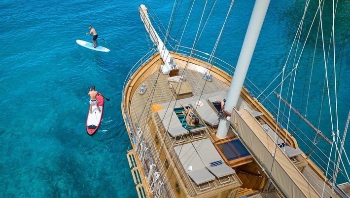 - El solarium está en proa, en una zona elevada con 8 colchonetas