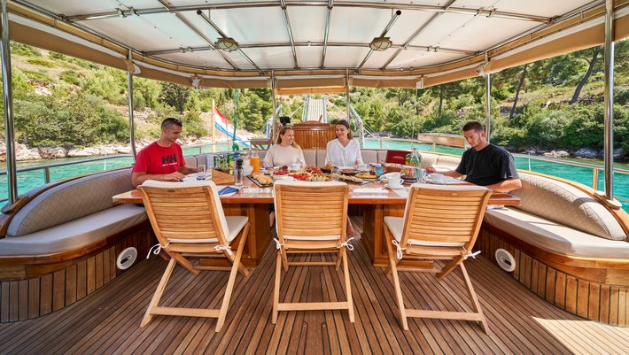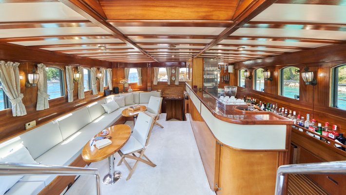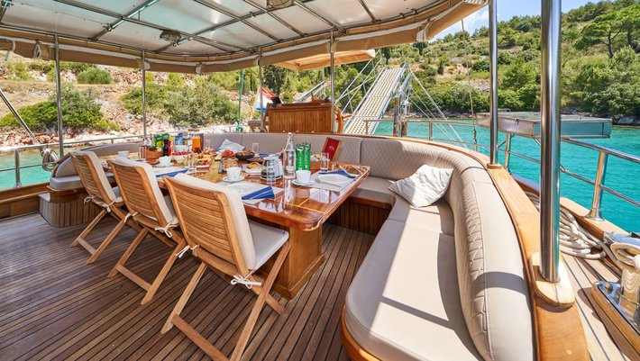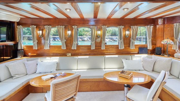 - Amplia zona de comedor en popa con mesa en U para 12 personas